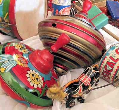 The toy top is just one of the many antique toys under the live Hemlock tree.