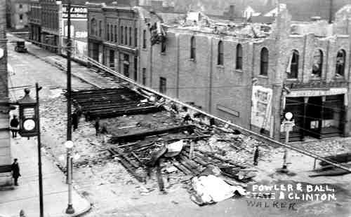 This is the aftermath of the 1920 Tornado that struck the Fowler & Ball Hardware store and removed the third story and depositing the debris on E. Walker St. That story was never replaced. This building was later occupied by Merit Shoe store.