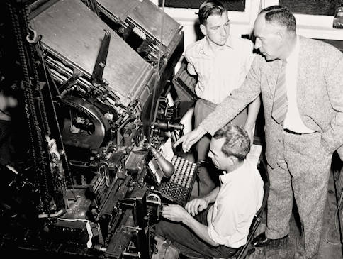 The editor played a joke on my uncle George Cornell when he was part of a school group touring the news office in the 1930s. He asked George if he had ever seen printer lice? Answering “no”, George bent over to get a close look after the editor sprinkled some water on a tray of loose slugs. When George was close enough, the editor slammed the slugs together, spraying George’s face with water. I suspect that little trick was sprung on many unsuspecting school boys.