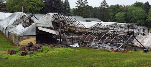 In the early morning of Sunday, August 2nd, two young men noticed a fire in the rear of the greenhouse at Howe’s Greenhouse & Flower Shoppe, LLC. Their quick response in calling 911 and the quick response of the area fire departments were the reason they didn’t have a total loss. The fire that started with a fan motor that burned out during that early morning which tragically caused damage to four of the six greenhouses, but thankfully didn’t reach the main building that encompasses the flower shop, design area, and office.
