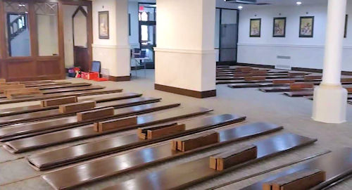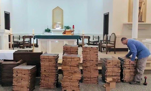 St Joseph church received their new solid hardwood pews bright and early on Tuesday morning. They were scheduled to be installed on Wednesday.